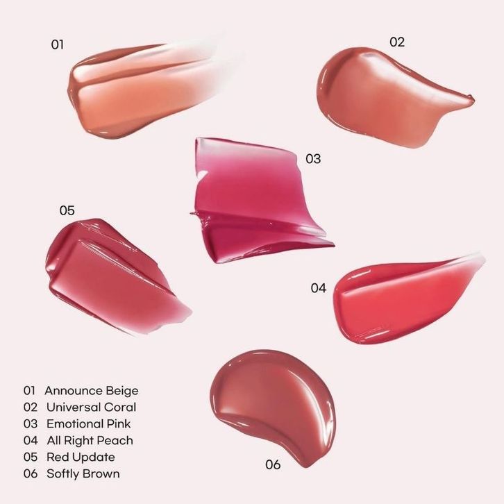 01 ANNOUNCE BEIGE, 02 UNIVERSAL CORAL, 04 ALL RIGHT PEACH, 05 RED UPDATE, 06 SOFTLY BROWN, 07 MUTE PARADISE, 08 PURE PINK, 09 COOL LEPATY-09/25, 10 CHAT COOL - 09/25, 15 BUYING PINK
