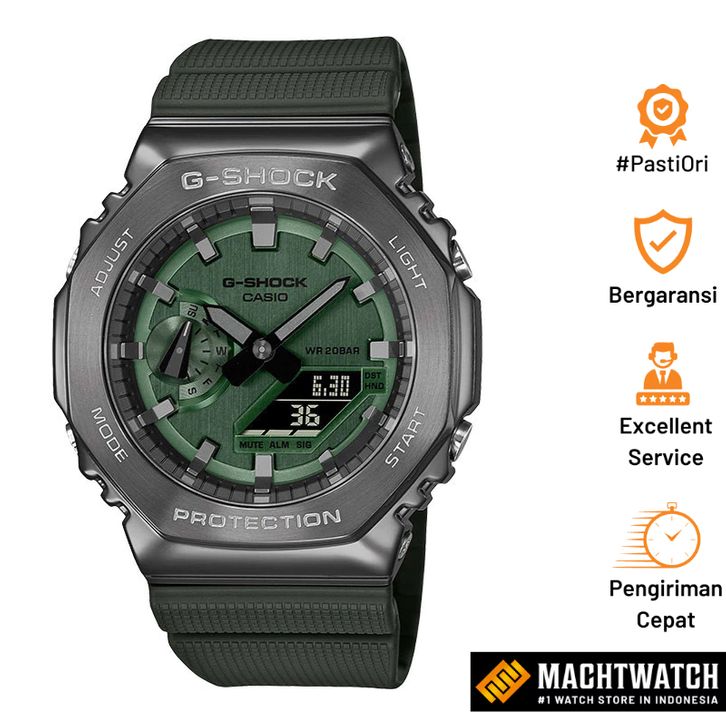 Jam Tangan Pria Casio G-Shock GM-2100B-3ADR CasiOak Metal Covered Green Analog Digital Dial Green Olive Resin Band