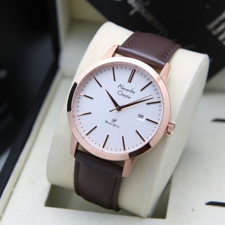 Jam Tangan Pria Alexandre Christie AC 1007 Rosegold White Leather Brown Original