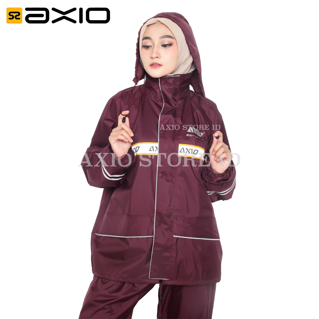 Jas Hujan Set Cewek Axio Merah Maroon Original Taslan Anti Bocor Jas Hujan Set Celana Mantel Hujan Wanita