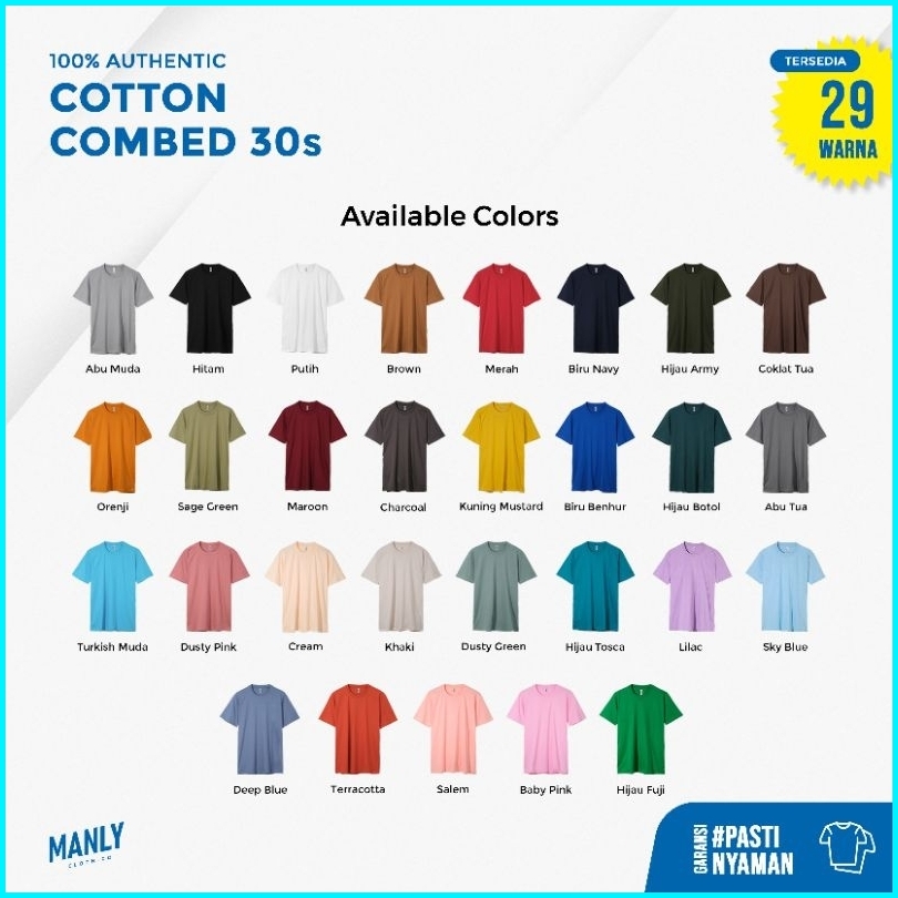 1.HITAM, 2.BIRU DONGKER, 3.MAROON BURGUNDY, 4.HIJAU BOTOL, 5. ABU TUA, 7. TURKIS MUDA, 9.CHRACOAL, 10.PUTIH, 11. COKLAT, 12. HIJAU ARMY, 6.MERAH SPESIAL, 8. BIRU BENHUR, 13. BROWN, 14. SAGE GREEN, 15. TERACOTA, 16. ABU MUDA, 17. LILAC, 18. SKY BLUE, 19. HIJAU TOSCA, 20. DUSTY PINK, 21. DUSTY GREEN, 22. KUNING MUSTARD, 23. SALEM, 24. CREAM, 25. KHAKY, 26. ORENJI, 27. DEEP BLUE, 28. PINK BABY, 29. HIJAU FUJI, 30. ATLANTIC SEA, 31. KUNING KENARI
