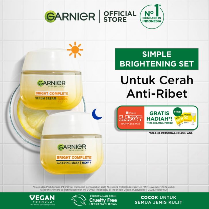 Paket Skincare Garnier Bright Complete Vitamin C Simple Set - Krim Pagi & Krim Malam Mencerahkan (Day Cream 50 ml + Nigh