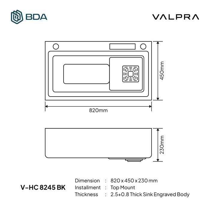 Valpra Kitchen Sink 1 Lubang Wastafel Cuci Piring Tempat Cuci Piring Stainless Bak Cuci Piring Stainless V HC 8245 BK