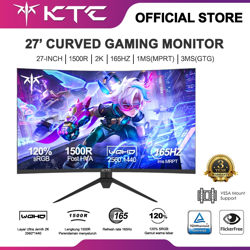 KTC Monitor gaming KTC 27inci 1500R 2K refresh tinggi 165Hz 1MS respons cepat LCD 8 bit gamut warna lebar
