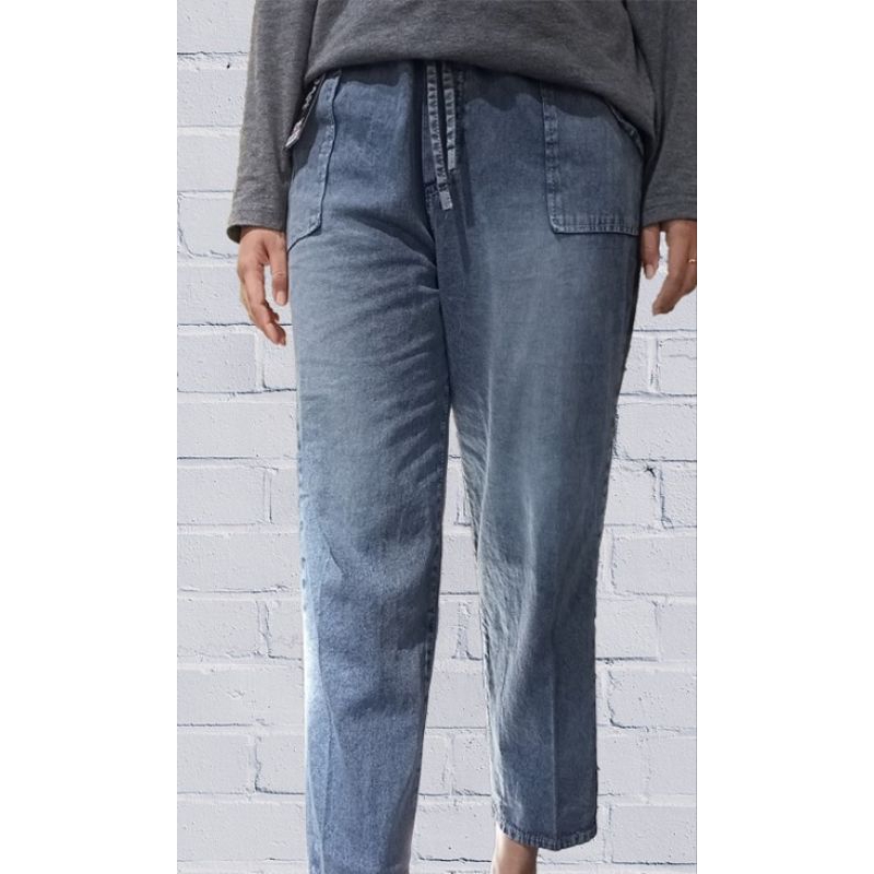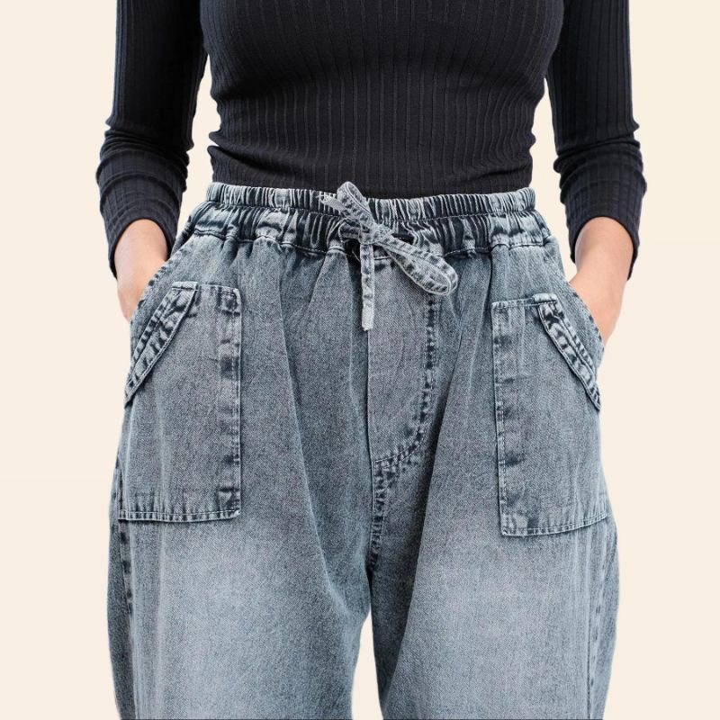 Celana Baggy Jeans Wanita Denim Casual Pinggang Karet Elastic Waist Mom Tapered Jeans
