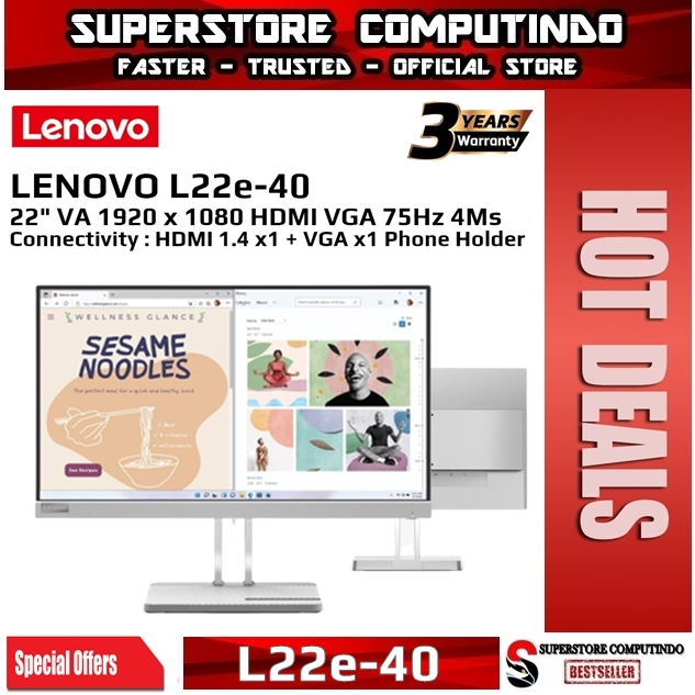 Monitor Lenovo L22e-40 22" 1080p 75Hz 4Ms VGA HDMI Silver Phone Holder