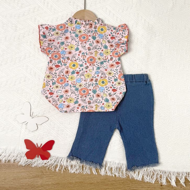 KF CAT Setelan Anak Perempuan Set Lengan Pendek Celana Jeans Panjang Renda Kasual Style 1-4 Tahun