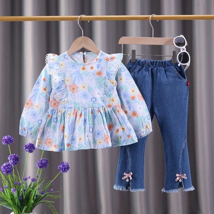 KFCAT Setelan Baju Anak Perempuan Lengan Panjang Katun Jeans Motif Bunga Casual Style Usia 1-4 Tahun