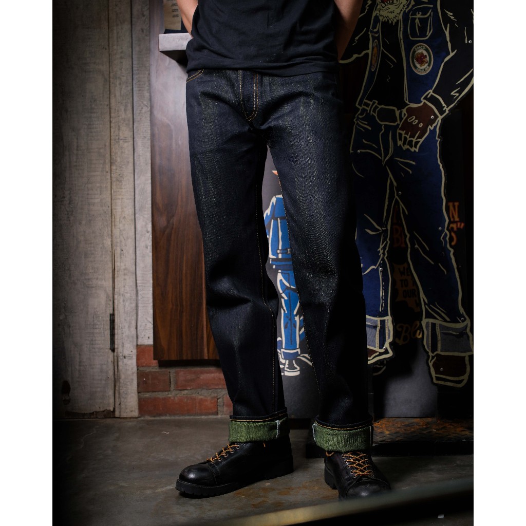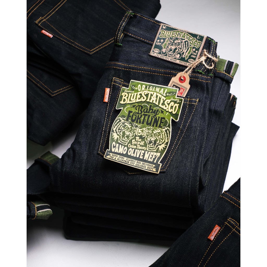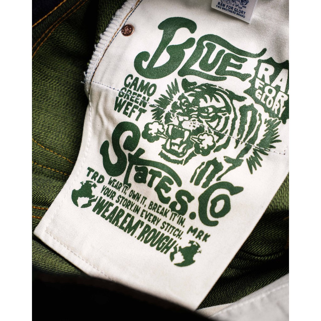 RAW SELVEDGE DENIM - BABY FORTUNE 15.5 OZ VINTAGE INDIGO CAMO OLIVE GREEN WEFT SANFORIZED SLIM STRAIGHT / SLIM FIT JEANS