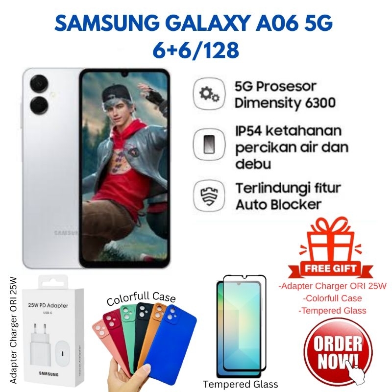 SAMSUNG GALAXY A06 5G 6/128 IP54 A 06 5G DIMENSITY 6300 5G FREE ADAPTER CHARGER ORI 25W RAM 6+6GB ROM 128GB GARANSI RESMI