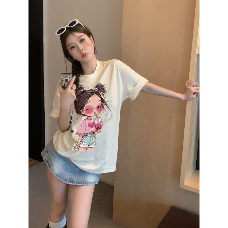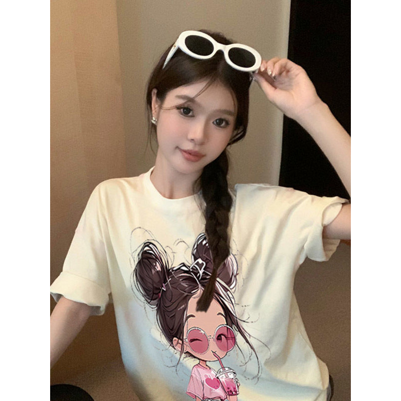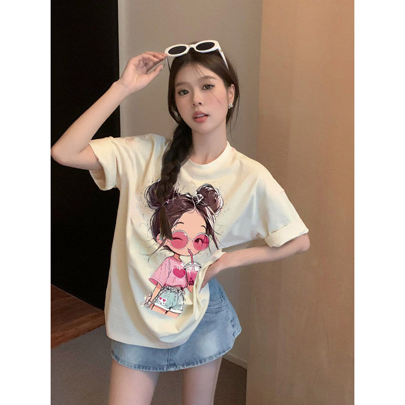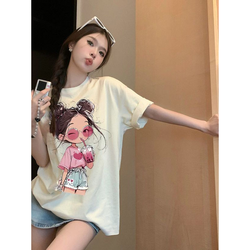 2toyoung Kaos wanita gaya Korea, gadis minum teh susu mutiara, katun murni bernapas, atasan kasual longgar