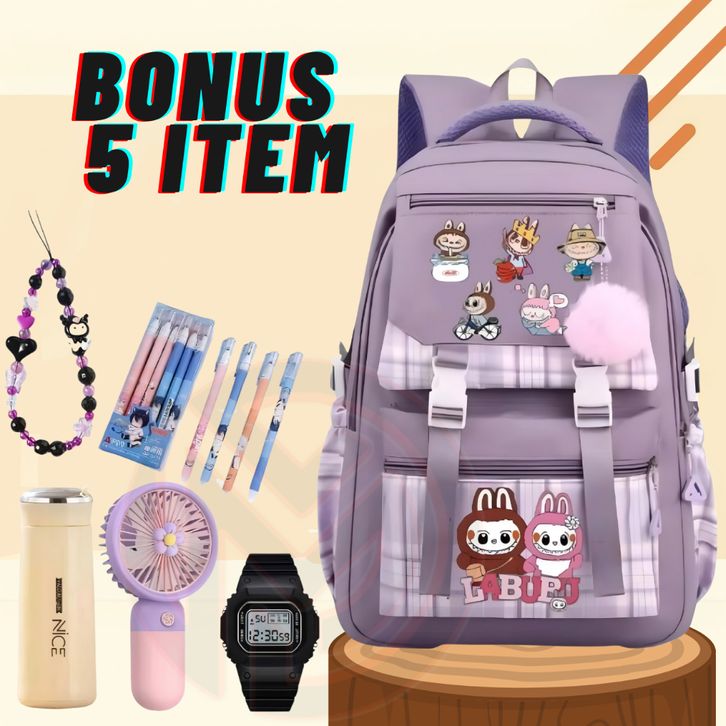 TERBARU Tas Ransel Anak Perempuan LABUBU Bags Tas Sekolah Anak SD&SMP Free Botol Minum Jam Impor kipas mini