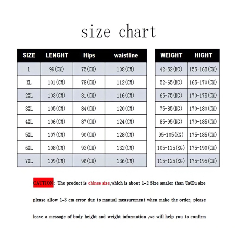 XL / 50-60kg, 2XL / 60-70kg, 3XL / 70-80kg, 4XL / 80-90kg, 5XL / 90-95kg, 6XL / 95-100kg, 7XL / 100-105kg