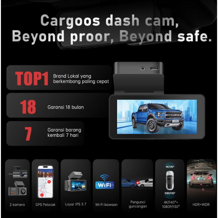 Cargoos Mirai 2c Dash Cam 4K Car DVR Mobil GPS 2 Kamera Camera Wifi GPS