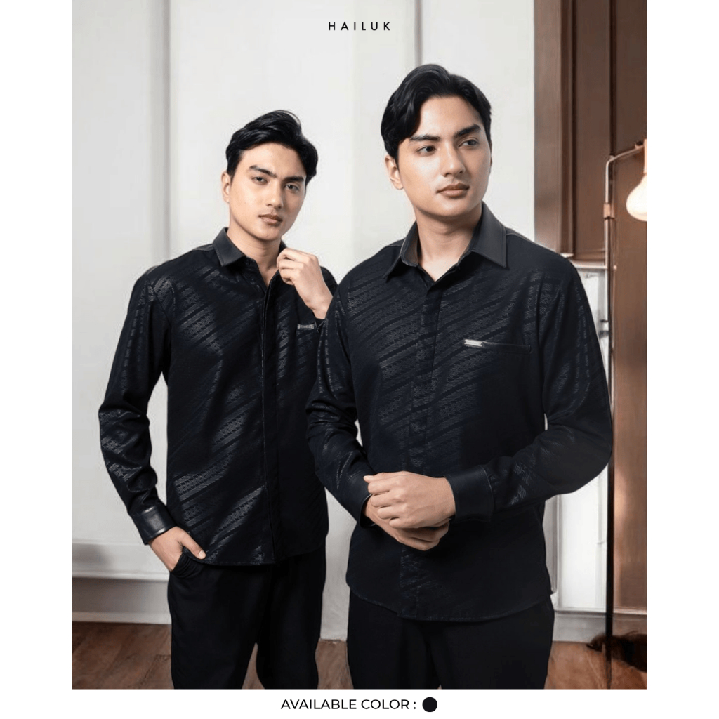 HAILUK Dilan Kemeja Batik Hitam Pria Slimfit Lengan Panjang