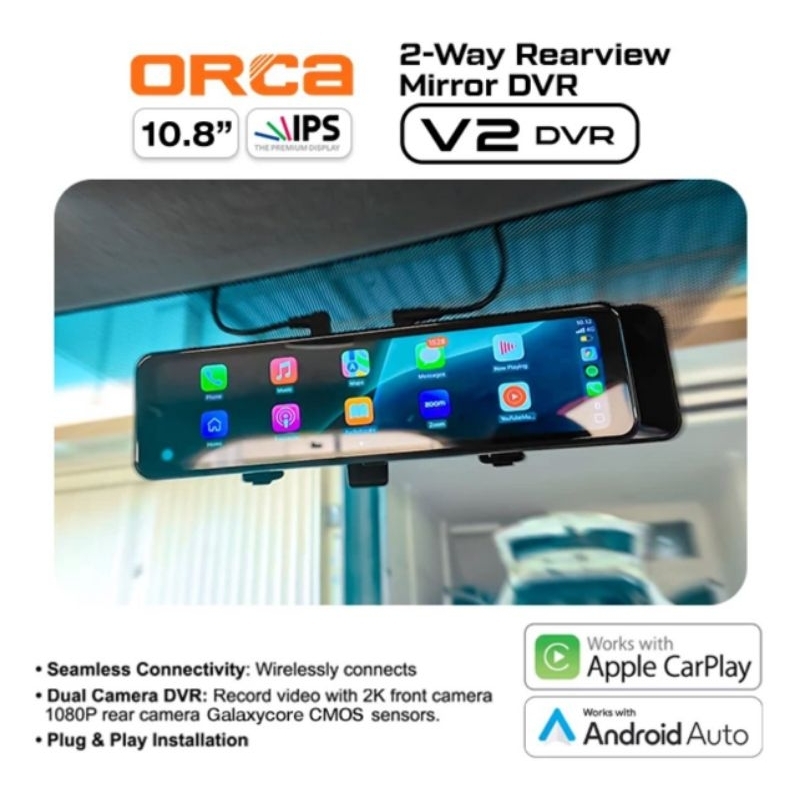 ORCA Dash Cam V2 DVR 10.88″ Monitor Spion Tengah Layar Sentuh 2K Apple CarPlay Android Auto