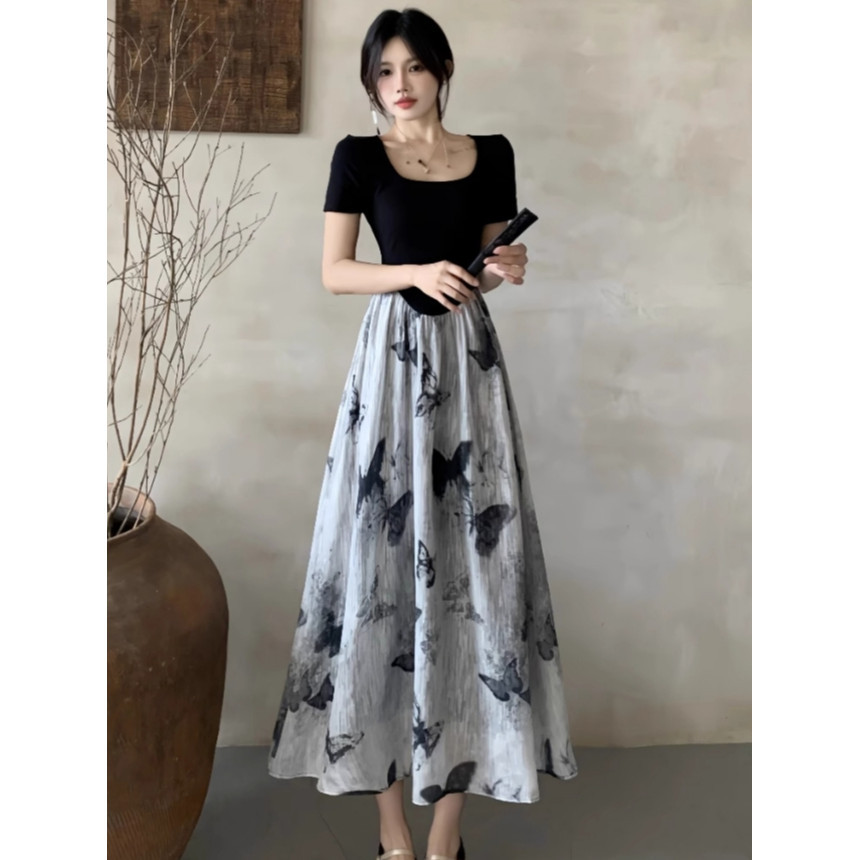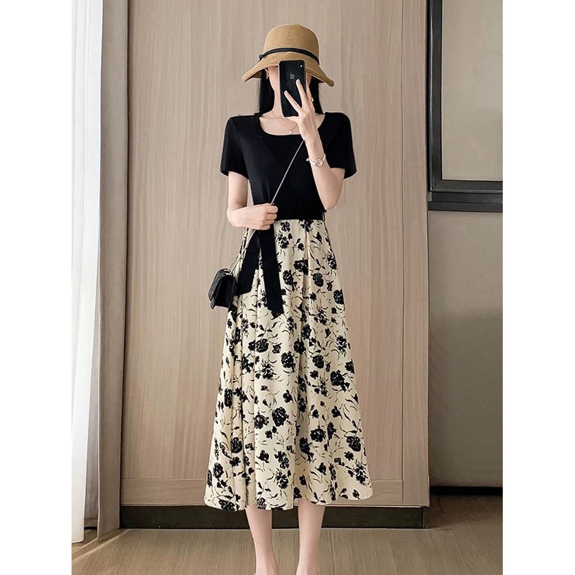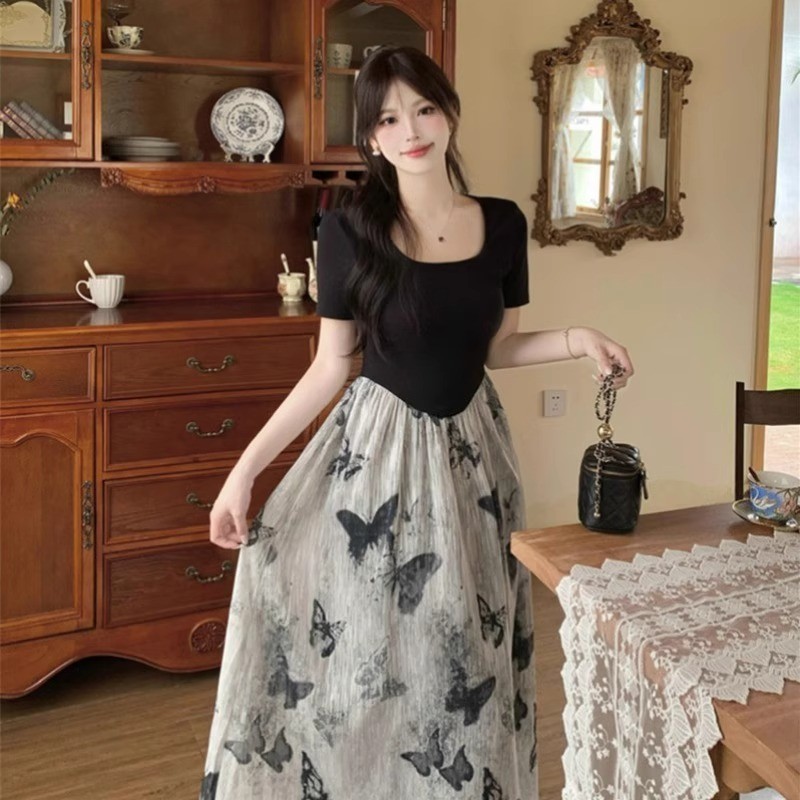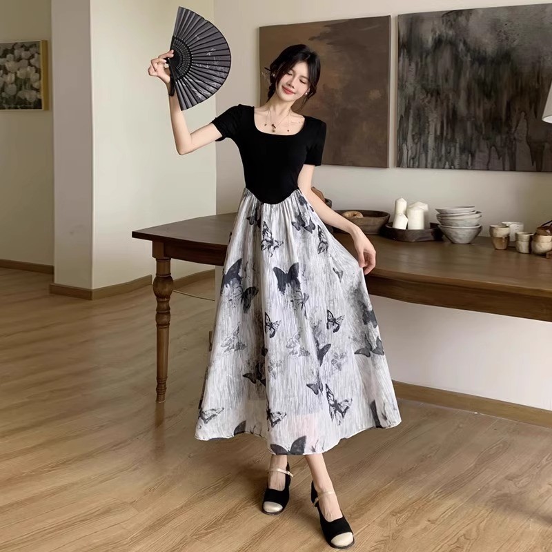 MEIRONG BAJU MIDI FLOWER DRESS HITAM WANITA JUMBO KOREAN STYLE BIGSIZE DRESS PESTA KOREA TERBARU 2025