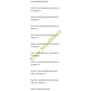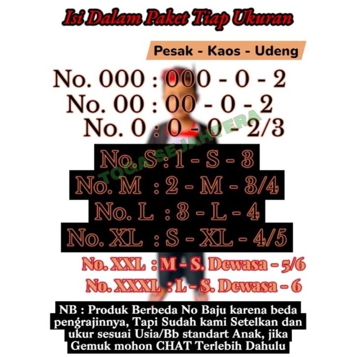0 (2 Tahun), 00 ( 1 tahun ), 000 ( baby new), L (6-7th), M (4-5th), S (3 tahun), XL (8-9th), XXL (10-11th), XXXL (11-12th)