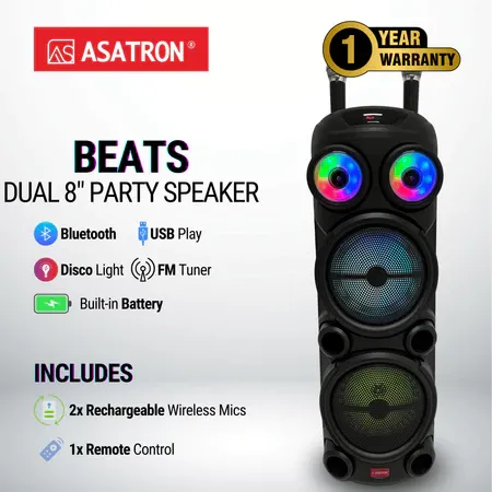 Asatron Beats Dual 8 Inch Bluetooth Party Speaker with 2 Wireless Mic Rechargeable
