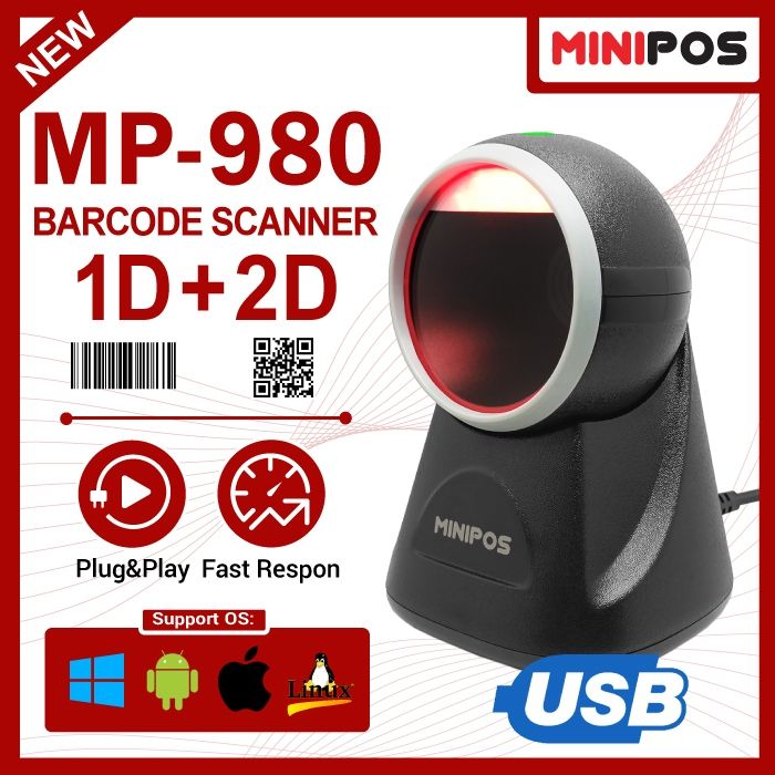 Bar e Scanner 1D 2D MINIPOS MP-980 USB Auto Scan GS1 AI Standard Plug N Play Fast Respon No Delay