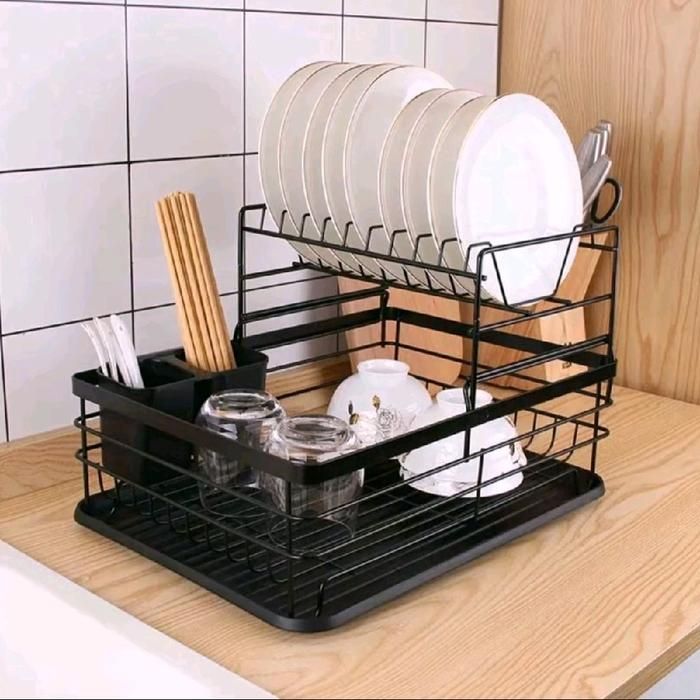 Rak Dapur Stainless Anti-Karat Penyimpanan Piring Mangkuk Gelas Pisau Cangkir 2 Lapis dengan Tatakan Tampungan Air Eleg