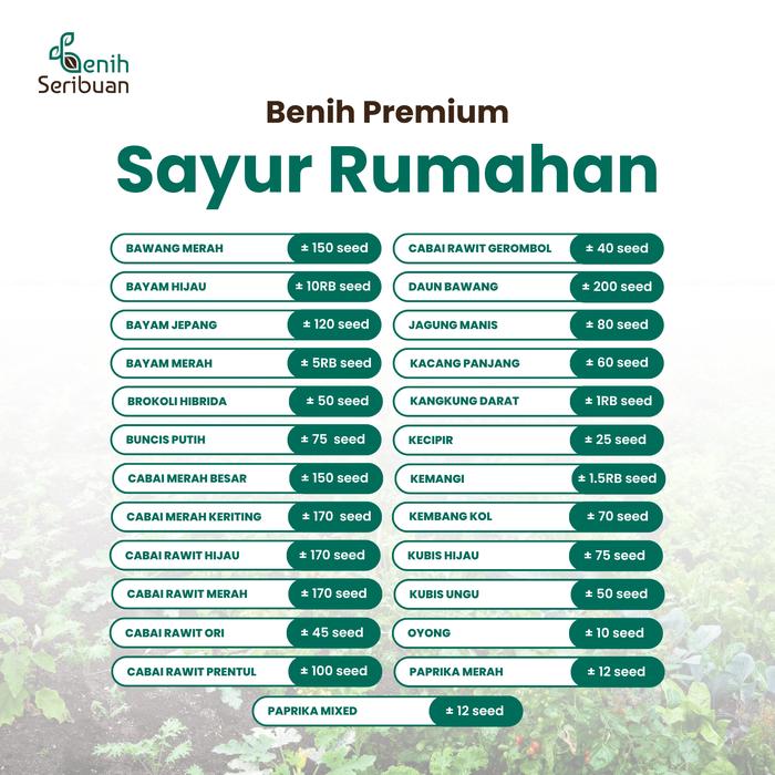PREM BAWANG MERAH, PREM BAYAM HIJAU, PREM BAYAM JEPANG, PREM BAYAM MERAH, PREM BROKOLI F1, PREM BUNCIS PUTIH, PREM C MERAH BESAR, PREM C RAWIT GROMBOL, PREM C RAWIT HIJAU, PREM C RAWIT MERAH, PREM C RAWIT ORI, PREM C RAWIT PRENTUL, PREM CMERAH KERITING, PREM DAUN BAWANG, PREM JAGUNG MANIS, PREM KACANG PANJANG, PREM KANGKUNG DARAT, PREM KECIPIR, PREM KEMANGI, PREM KEMBANG KOL, PREM KUBIS HIJAU, PREM KUBIS UNGU, PREM OYONG, PREM PAPRIKA MERAH, PREM PAPRIKA MIXED, PREM PARE, PREM SAWI CAISIM, PREM SAWI KAILAN, PREM SAWI MANIS HKG, PREM SAWI PAGODA, PREM SAWI PAKCOY, PREM SAWI PUTIH, PREM SELADA HIJAU, PREM SELADA MERAH, PREM SELEDRI, PREM SELEDRI BAT BSR, PREM SL BUTTERHEAD, PREM T CERI BULAT, PREM T CERI LONJONG, PREM TERONG HIJAU PJ, PREM TERONG UNGU PJG, PREM TIMUN BABY, PREM TIMUN LALAP, PREM TOMAT MAWAR, PREM TOMAT RAMPAI, PREM TOMAT SAYUR, PREM TR LALAP HIJAU, PREM TR LALAP UNGU, PREM WORTEL, PREM ZUCHINI HIJAU