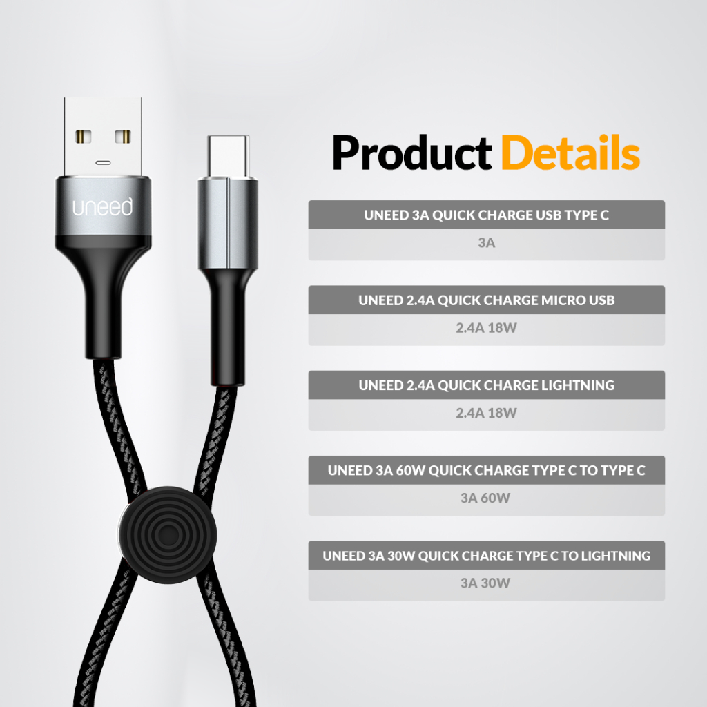 UNEED Kabel Data Quick Charge Type C Lightning Micro USB 20CM - UCB60