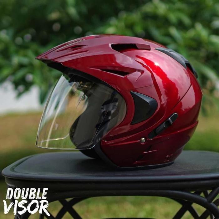 FLASH SALE HELM PRIA WANITA DEWASA JP8 DOUBLE VISOR WARNA MAROON GLOSSY HITAM GLOSSY