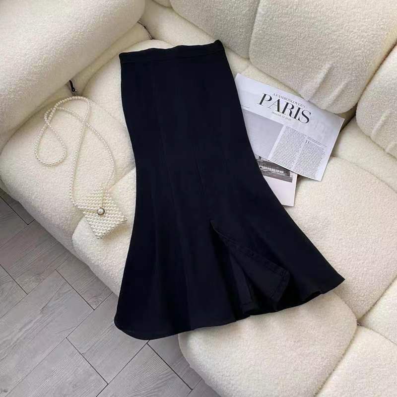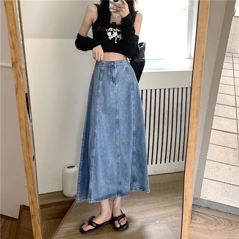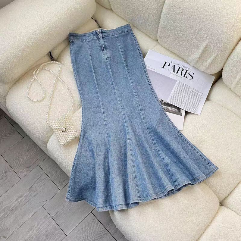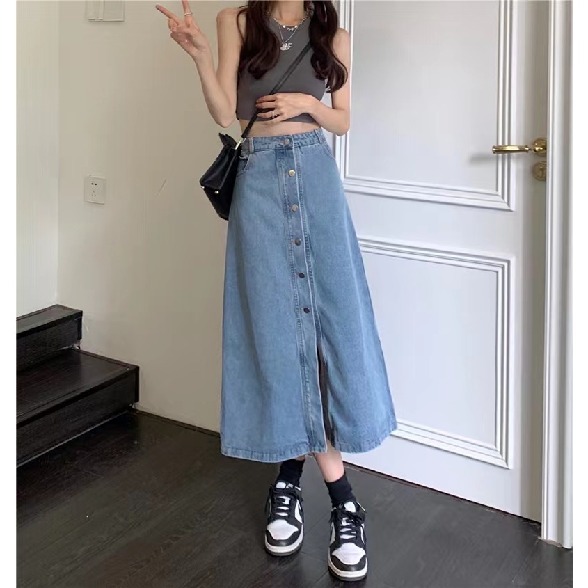 FASHION WANITA ROK PLISKET ROK JEANS PANJANG ROK 7/8 ROK FISHTAIL HIGH WAIST ROK BELAH DEPAN