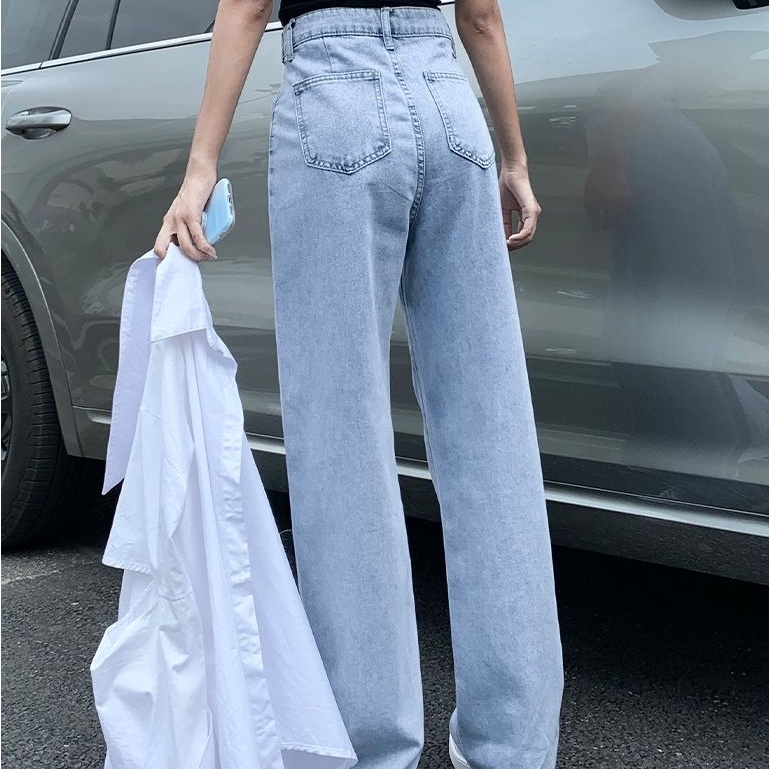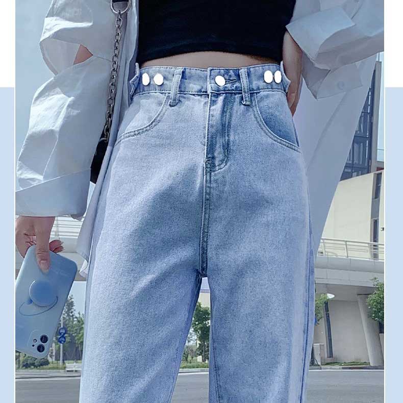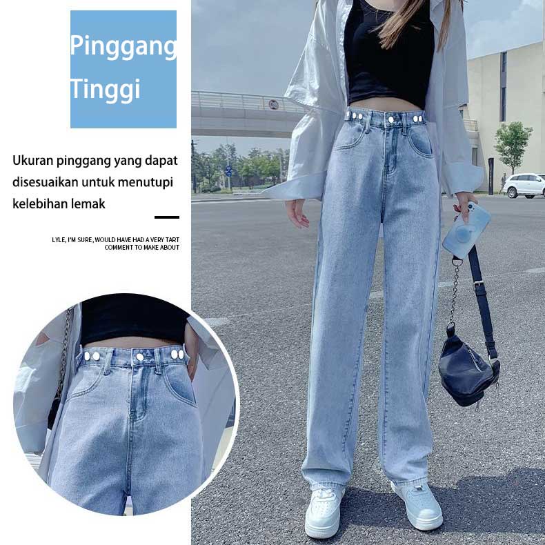 CELANA HIGH WAIST JEANS WANITA PINGGANG YANG DAPAT DI SESUAIKAN GAYA KOREA LURUS BERKAKI LEBAR