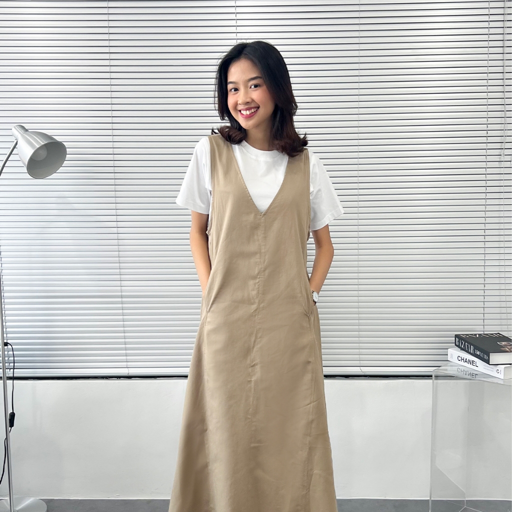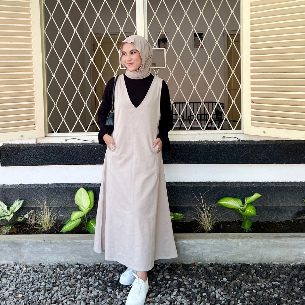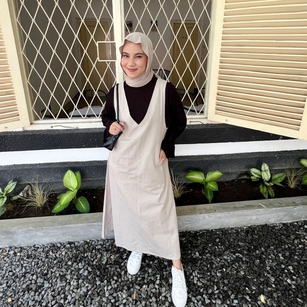 YEPPUOUTFIT - HYEWON OVERALL | BASIC LONG DRESS SIMPLE V LINE TANPA LENGAN BAHAN LINEN TWILL