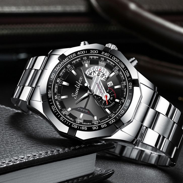 Jam Tangan Pria Sunlifex Tali Stainless Steel Kotak Kartu Garansi Kuarsa Kalender