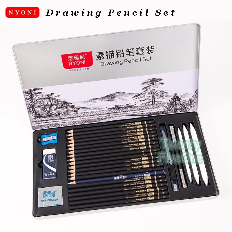 Nyoni Drawing Pencil Gambar Set 29PCS Drawing Sketch Pencil Set Tin Box Pensil Gambar
