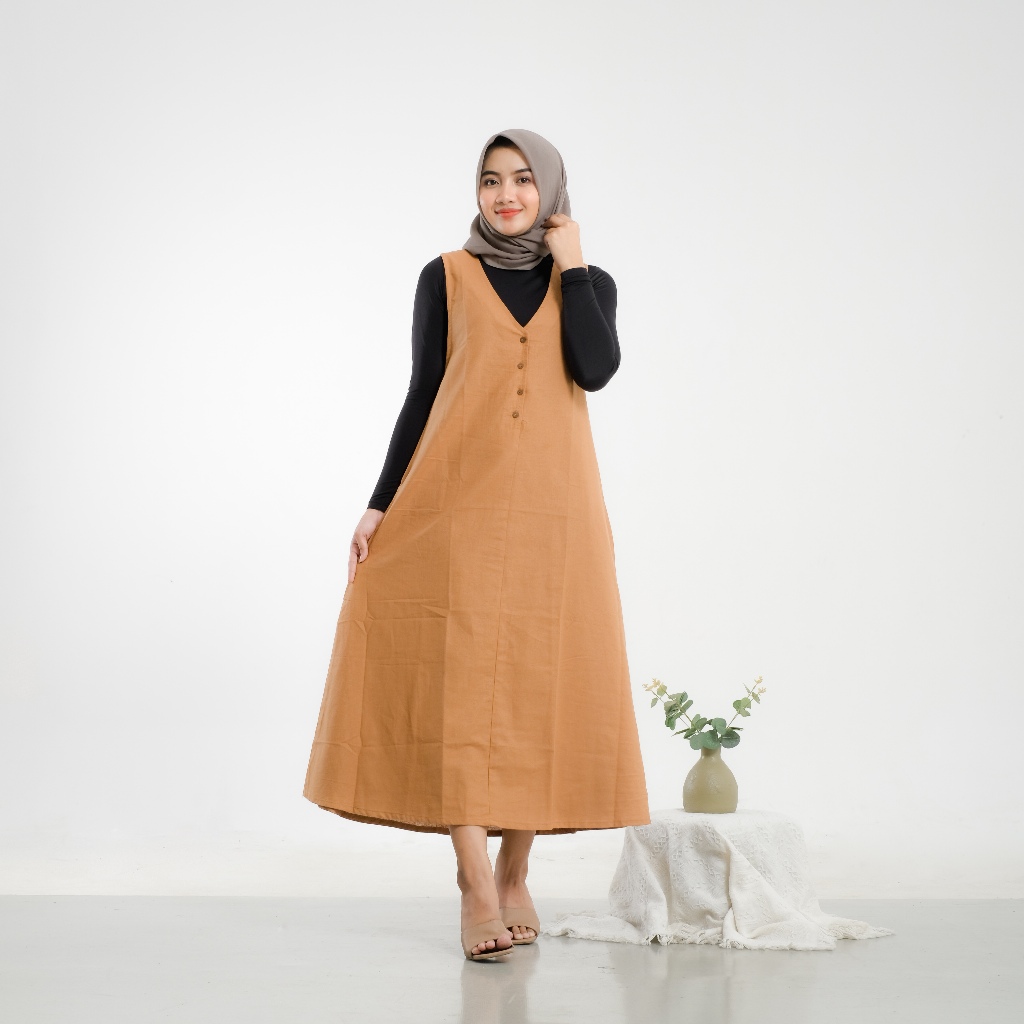 HAURA OVERALL POLOS LINEN LONG DRESS KOREAN LOOK KANCING DEPAN