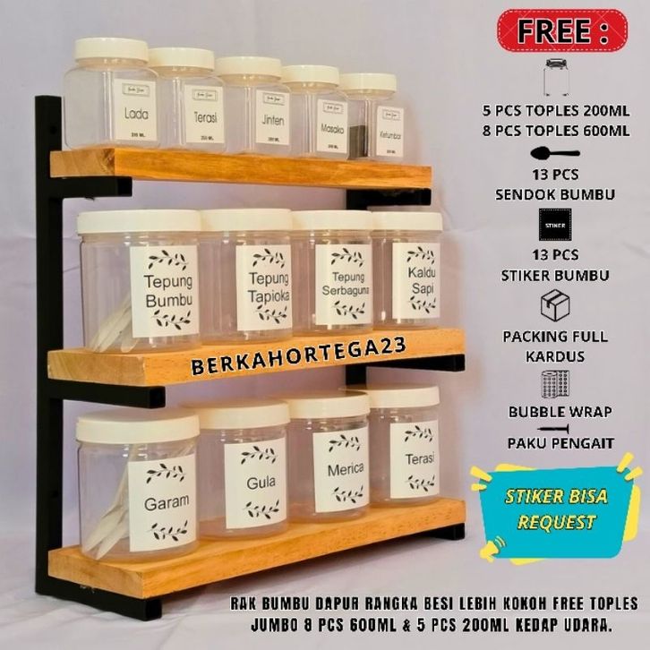 PROMO Rak Bumbu Dapur 3 Susun Medium RANGKA BESI WARNA HITAM Dengan 8pcs Toples Besar dan 5pcs Toples 200ml ORIGINAL
