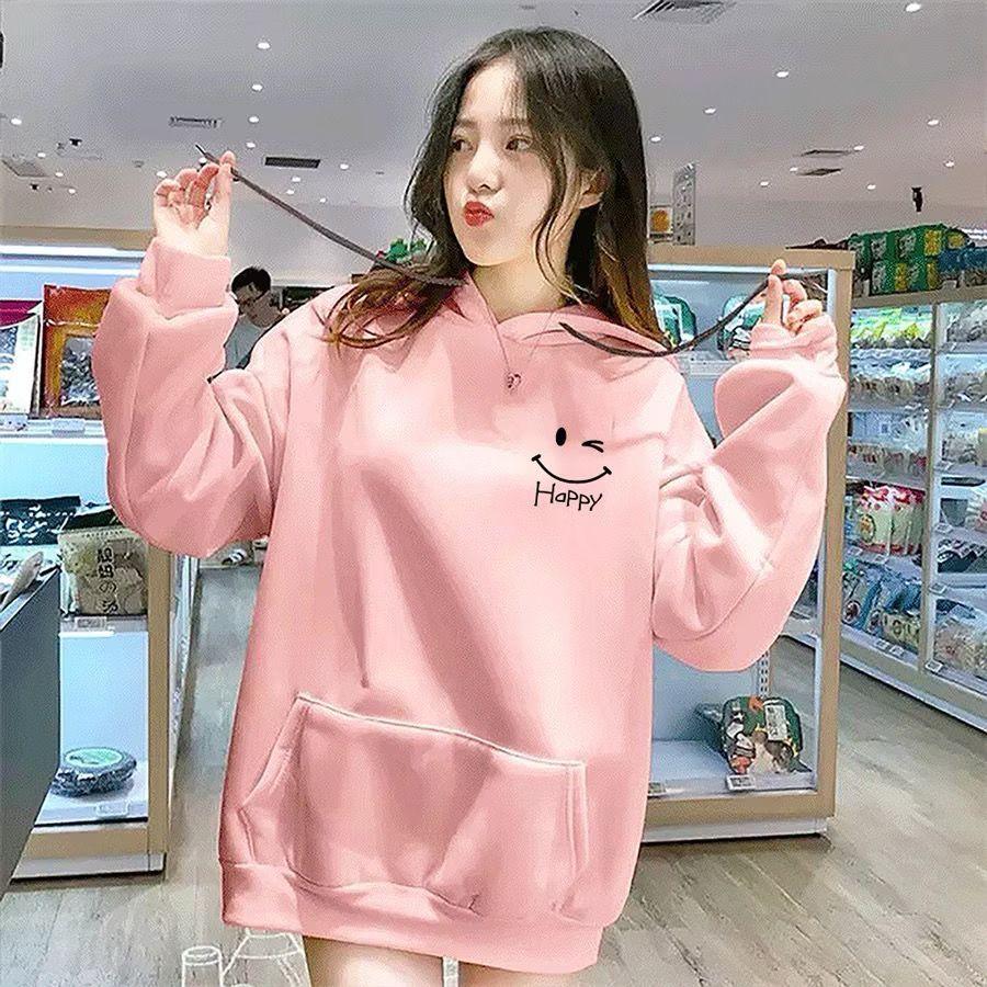 SWEATER HOODIE WANITA HAPPY OVERSIZE/SWEATER HOODIE KOREAN CEWE BAHAN FLEECE
