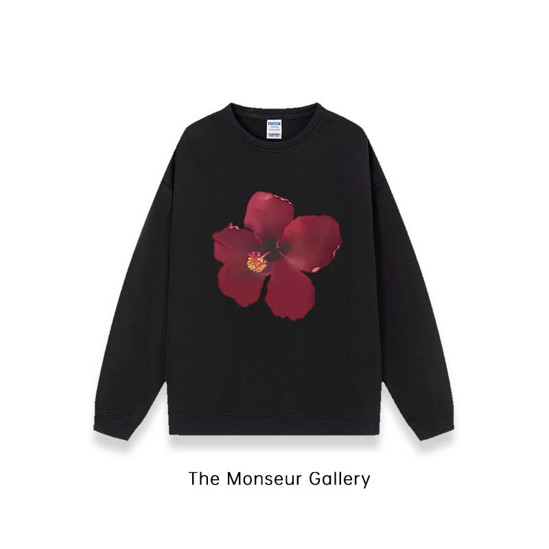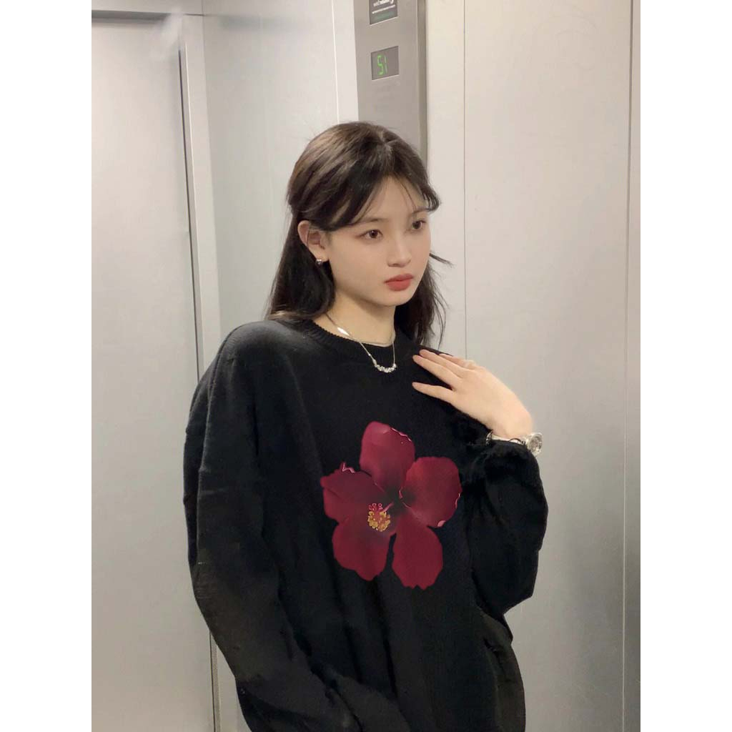 THE MONSEUR GALLERY SWITER WANITA OVERSIZE DESAIN BUNGA HIBISCUS ORCHID PRINT STYLE SWEATER OVERSIZE CREWNECK | SWEATER HITAM