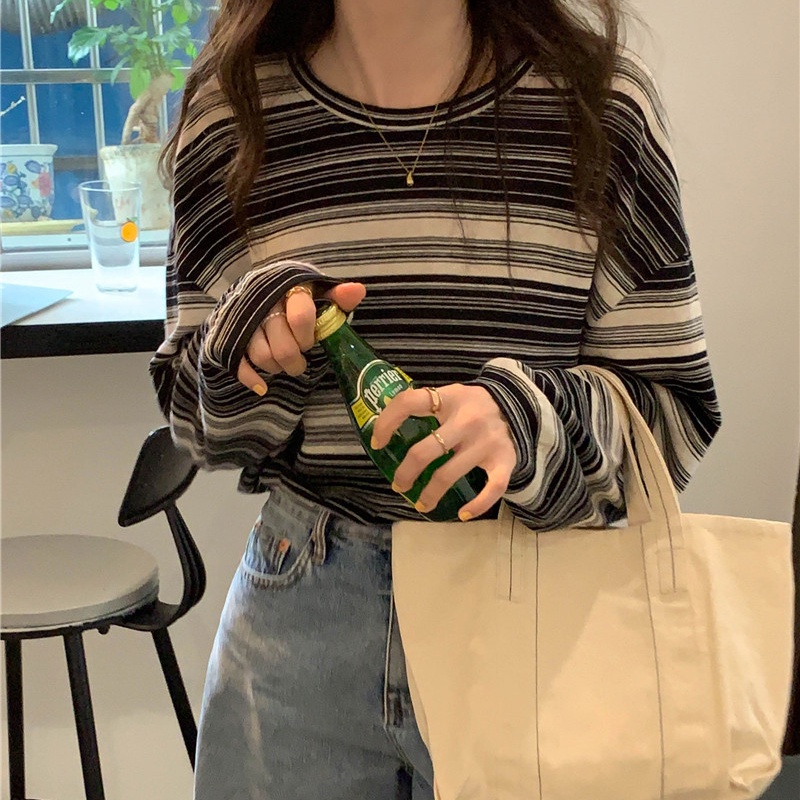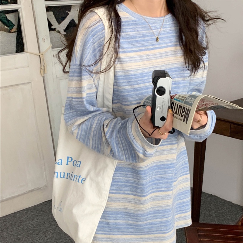 YIKOO-KOREA KAOS WANITA T SHIRT BERGARIS ATASAN LENGAN PANJANG T0P