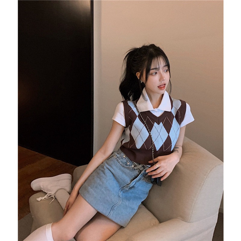 AERA KOREAN DIAM0ND PLAID KNIT VEST CROP T0P ROMPI RAJUT KOREA