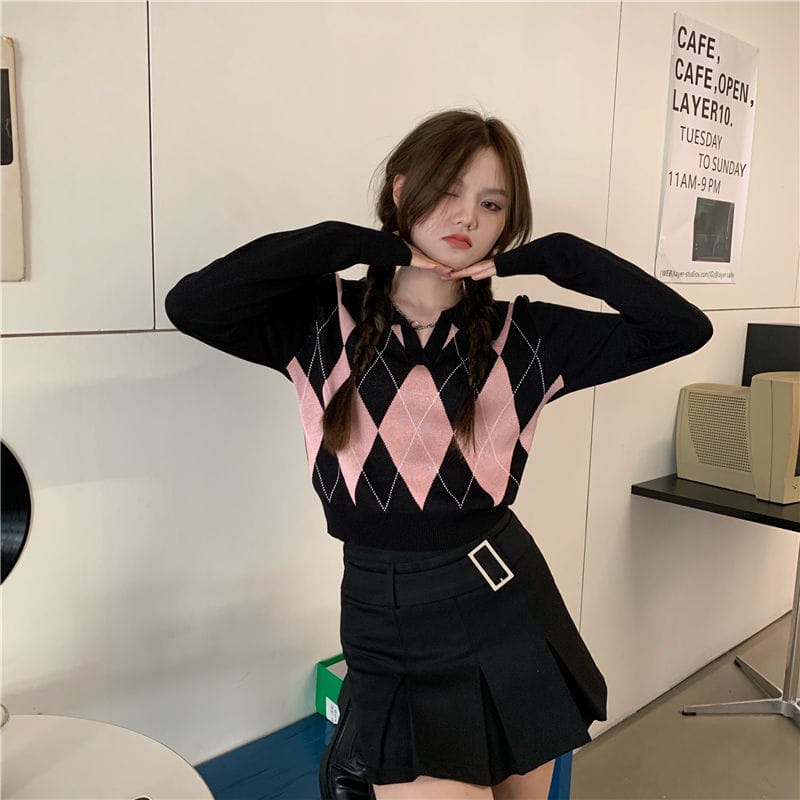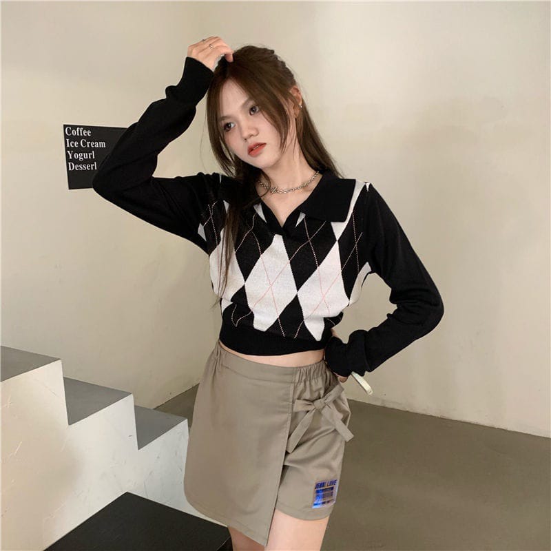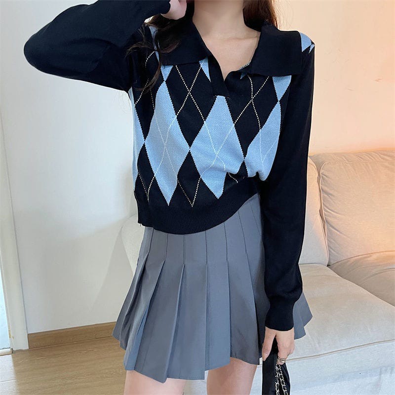 ARAA KNIT CROP T0P BLUE BLACK POLO COLLARED LONGSLEEVE PATTERNED |Y2K KOREAN FASHION