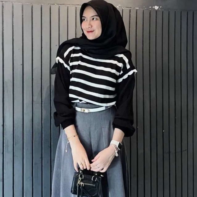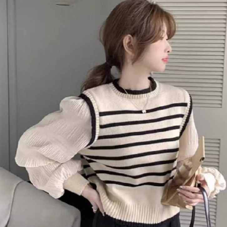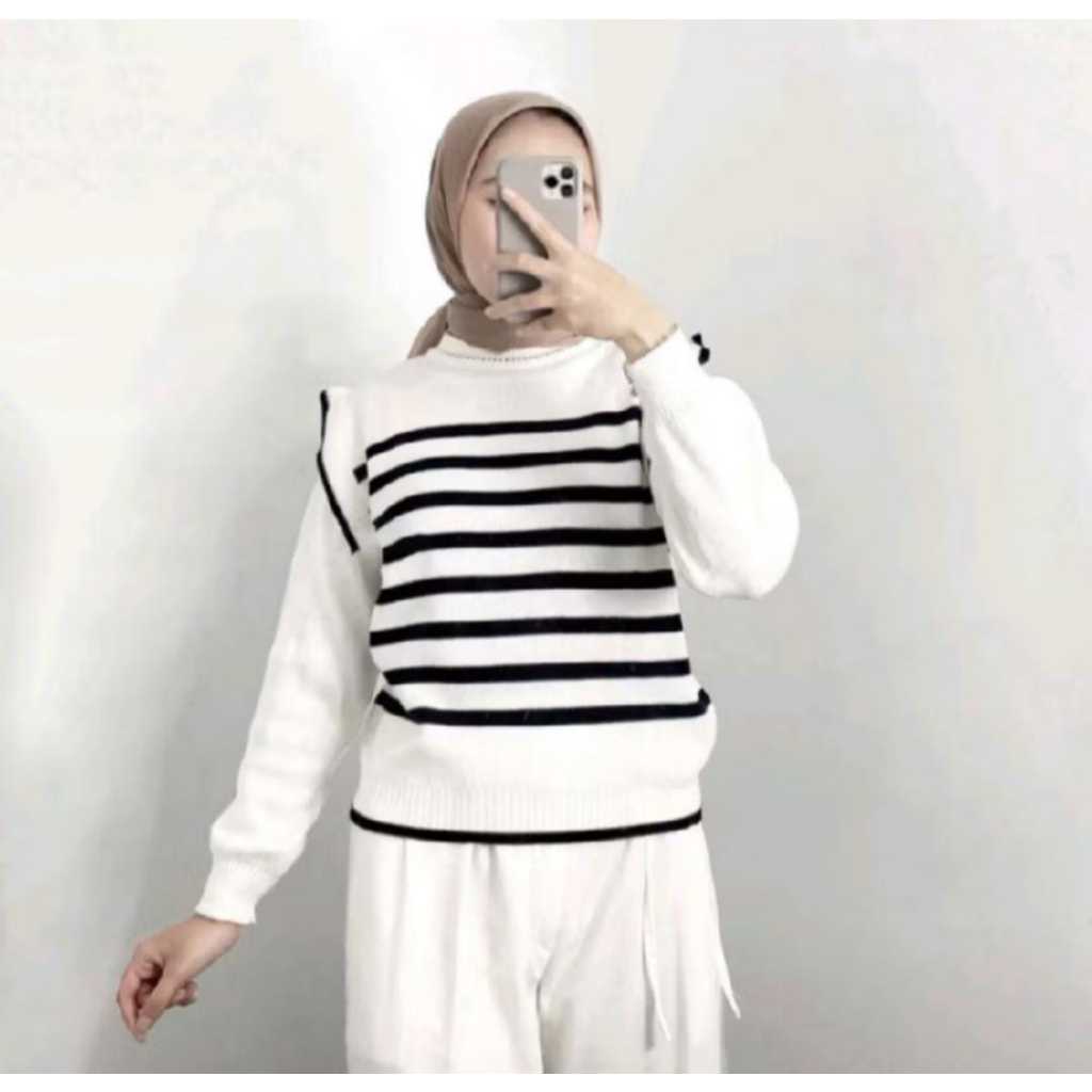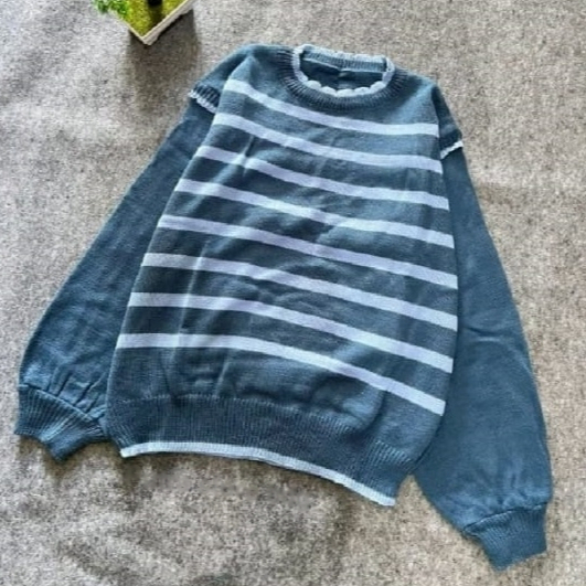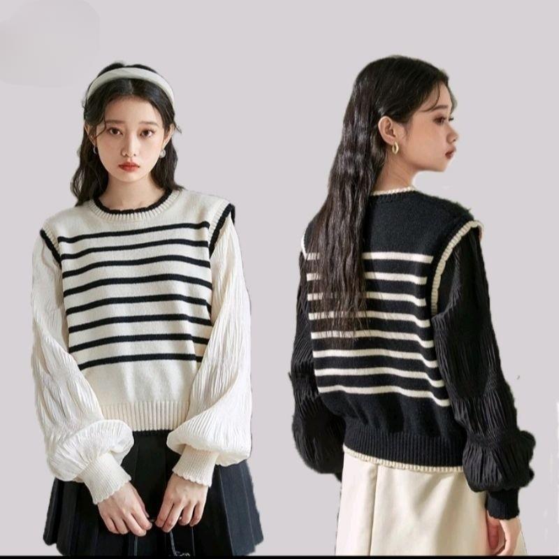 ATASAN/SWEATER RAJUT WANITA LENGAN BALON LENGAN PANJANG BASIC KOREAN GARIS KNIT TOPS OVERSIZE