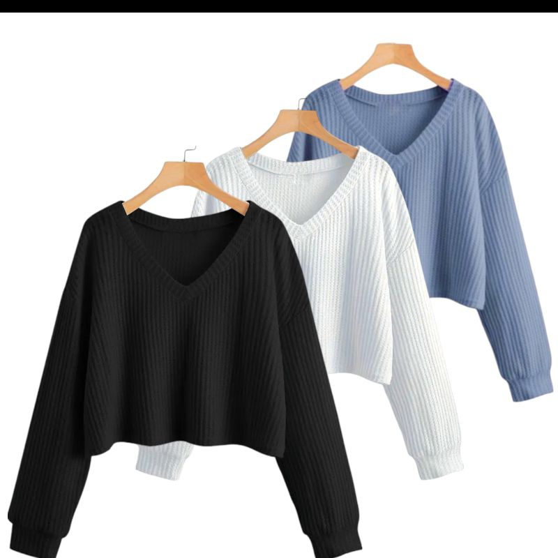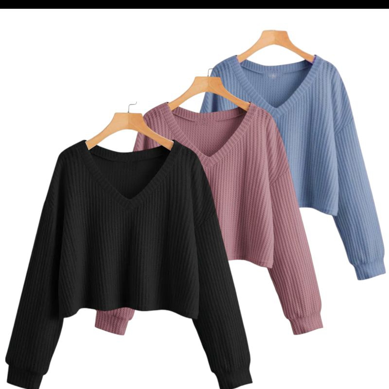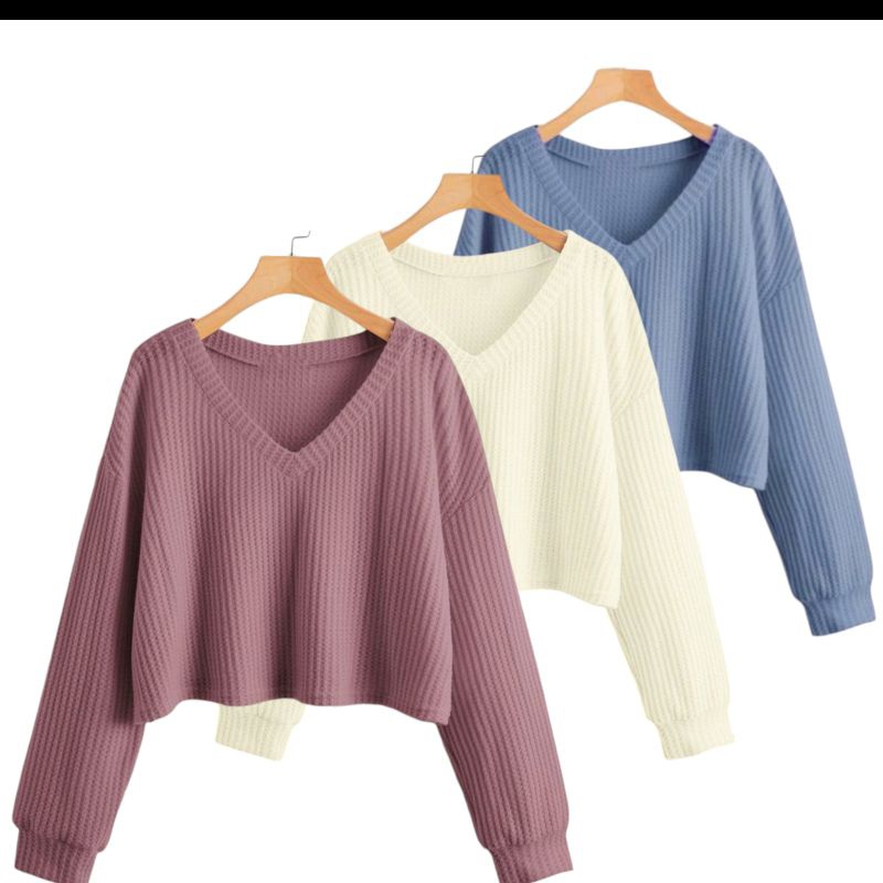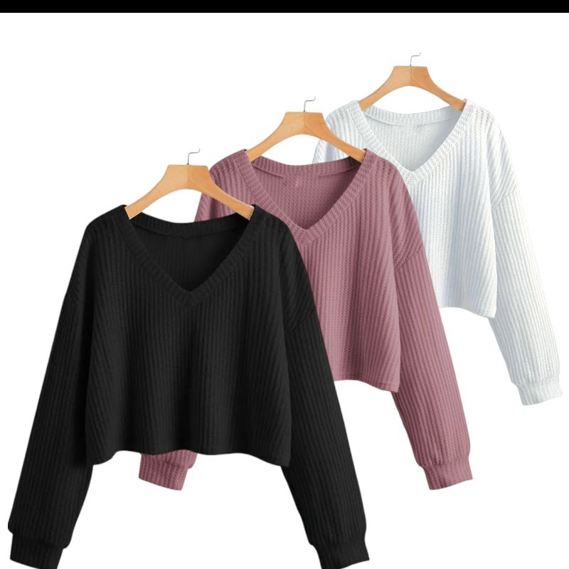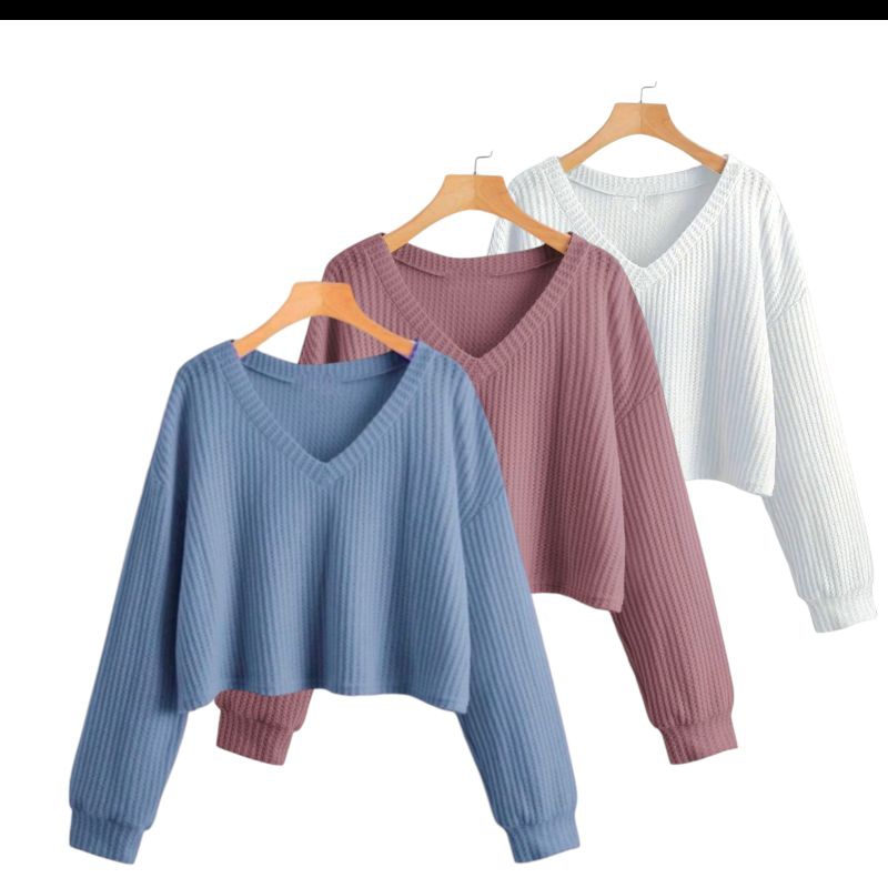 PAKET 3 PCS ATASAN CROP V WANITA LENGAN PANJANG