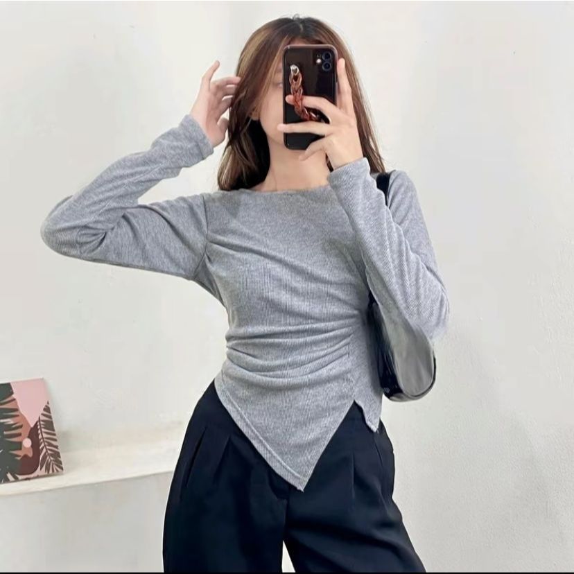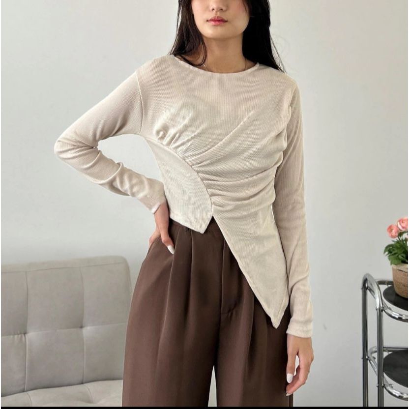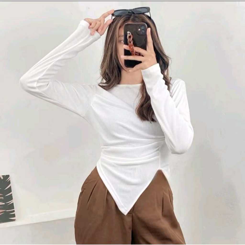 Crop Top Knit Rib Kerut Samping Yoora Top Blouse Lengan Panjang Kekinian Korean Style