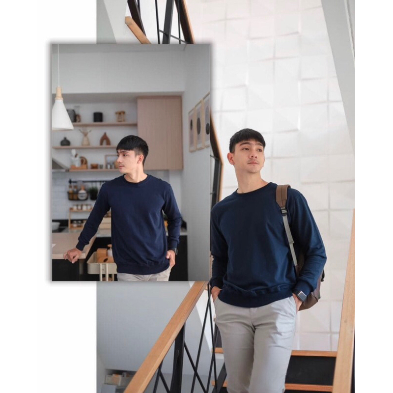 Sweater Pria Crewneck Polos Navy Biru Dongker Lengan Panjang Sweatshirt Cowok Oblong Unisex
