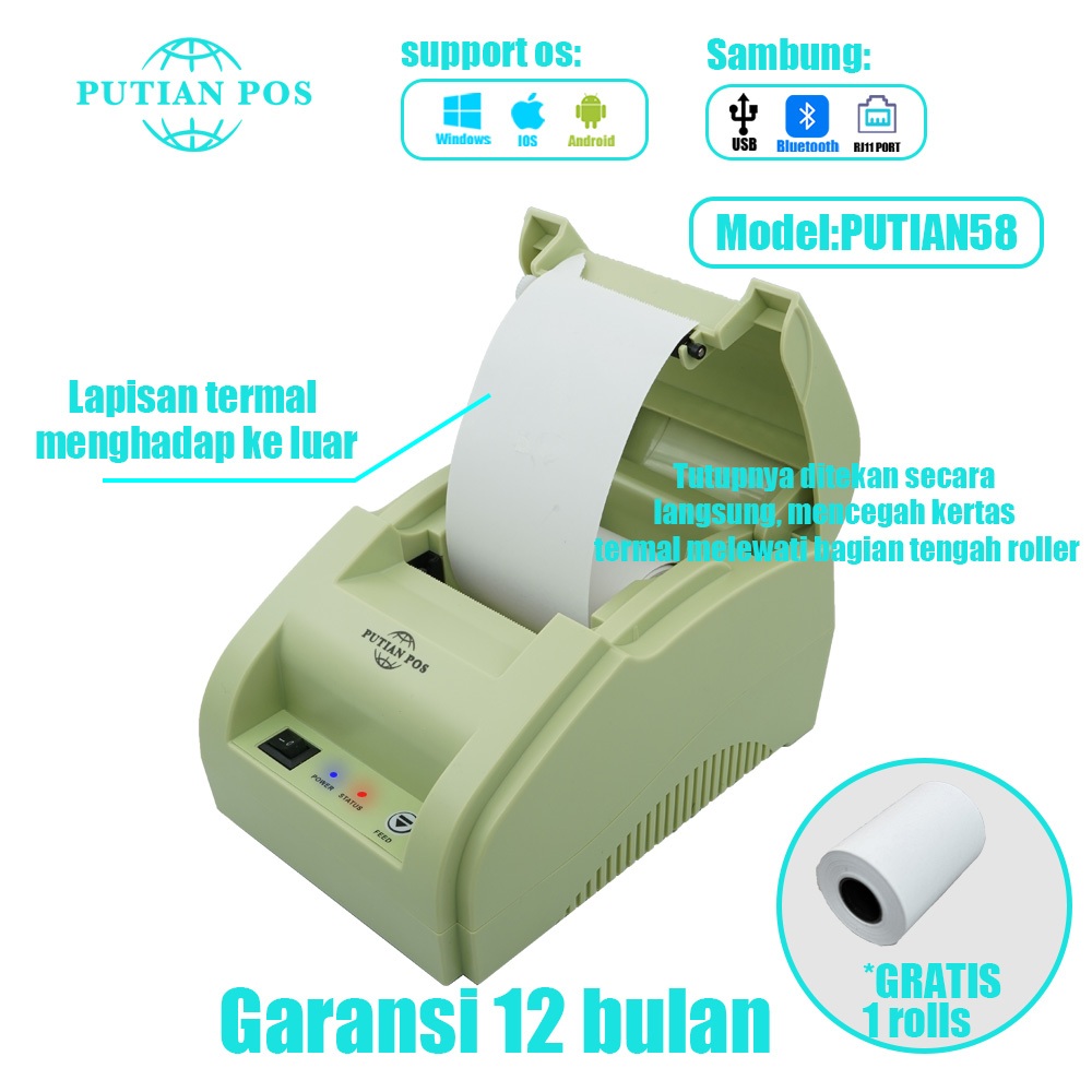 PUTIAN POS DESKTOP 58MM PRINTER TERMAL BLUETOOTH PUTIAN58 MENDUKUNG PORT USB, RJ11
