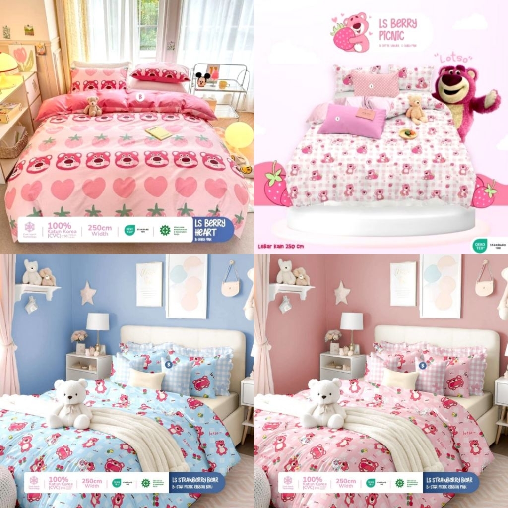 Set Bed Cover Seprei Sepre Seprai Anak Karakter Lotso Strawberry Merah Muda Ukuran 180x200 Free Sarung Bantal Guling