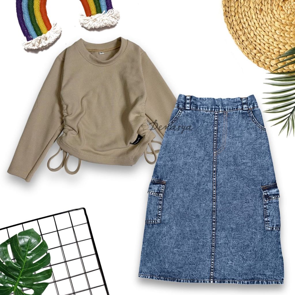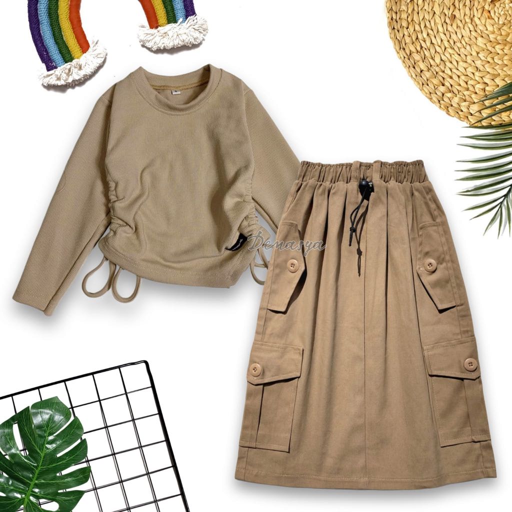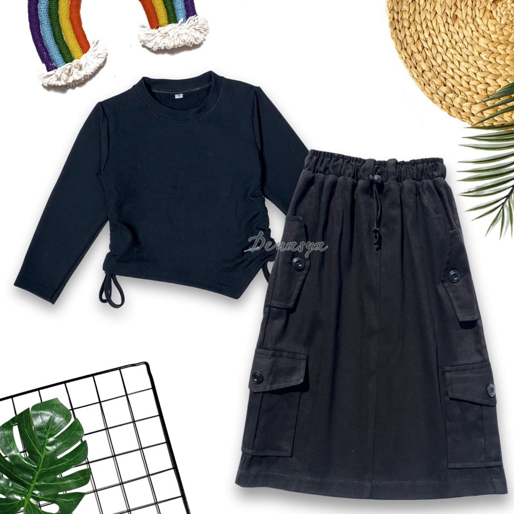 Setelan Rok Cargo Anak Perempuan / Rok Panjang Muslim Friendly Kekinian / Kaos Knit Croptop Usia 2-12 Tahun