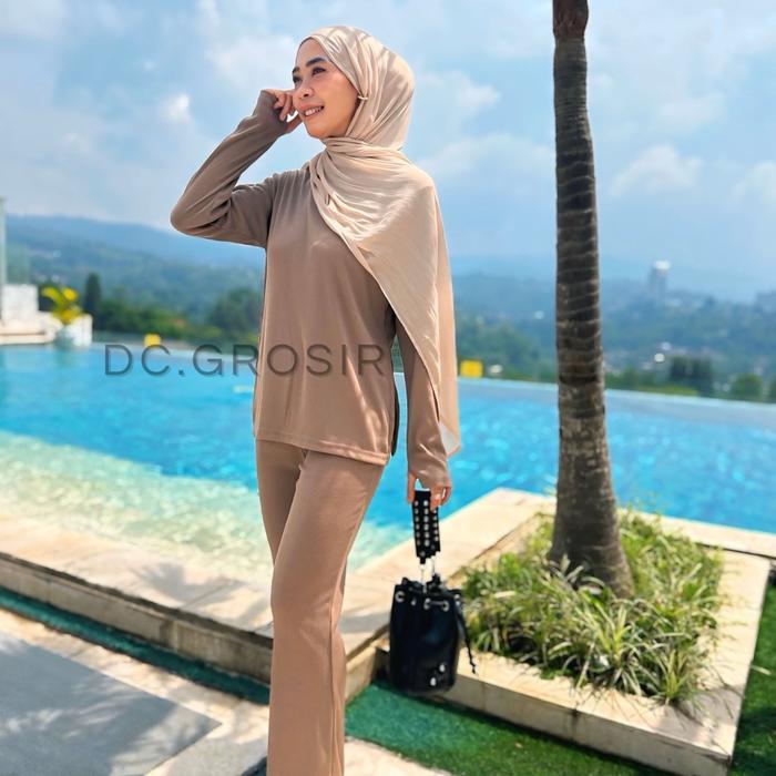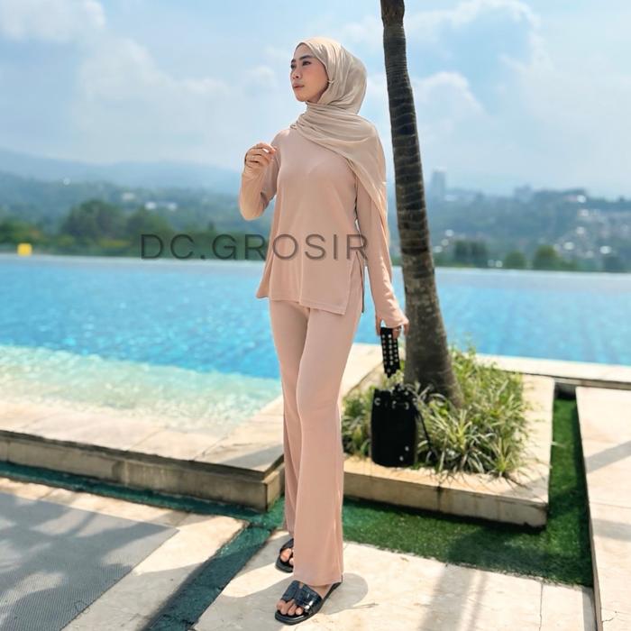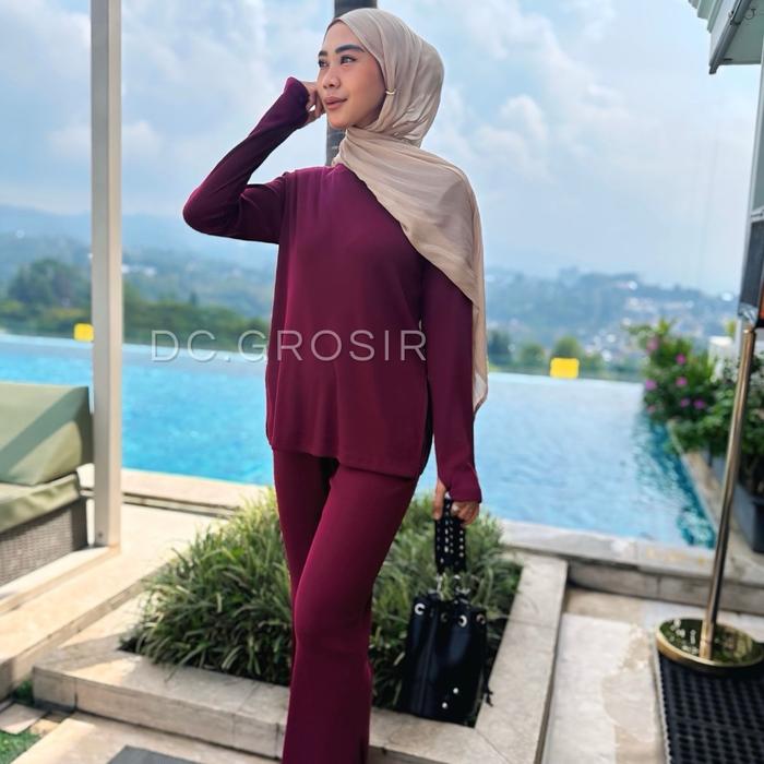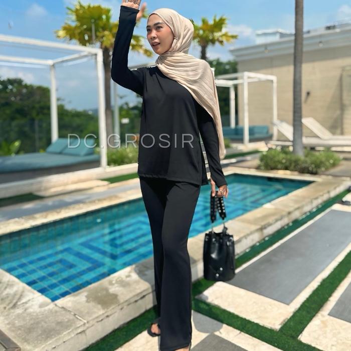 Pene Set - Setelan Wanita Oneset Lengan Panjang Knit Rib Shirt Pants Baju Set Celana Highwaist Atasan - Hitam, M