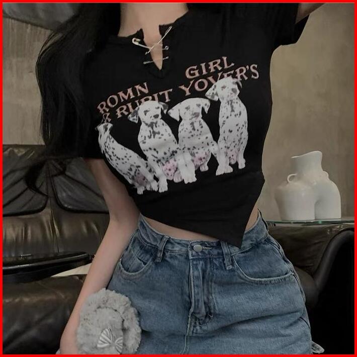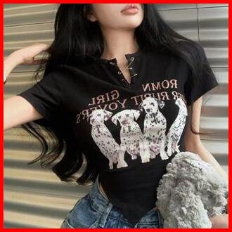 Pin Neck Irregular Crop Top Graphic T-shirt 2173 S M L