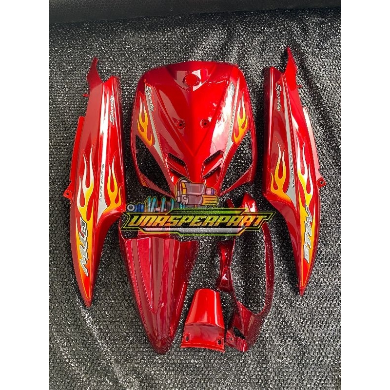 cover full body halus yamaha mio sporty merah maron plus striping api 2004-2007